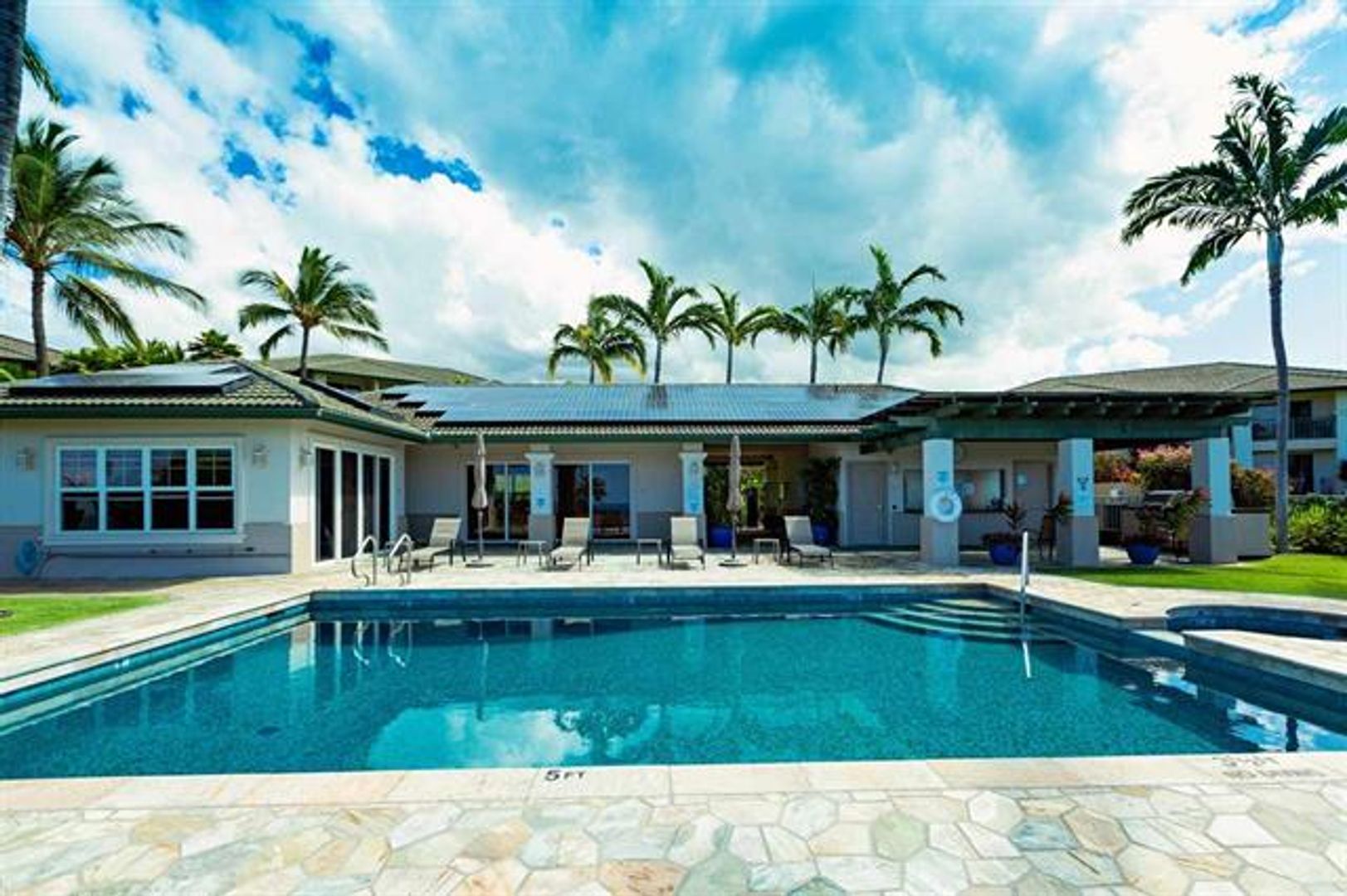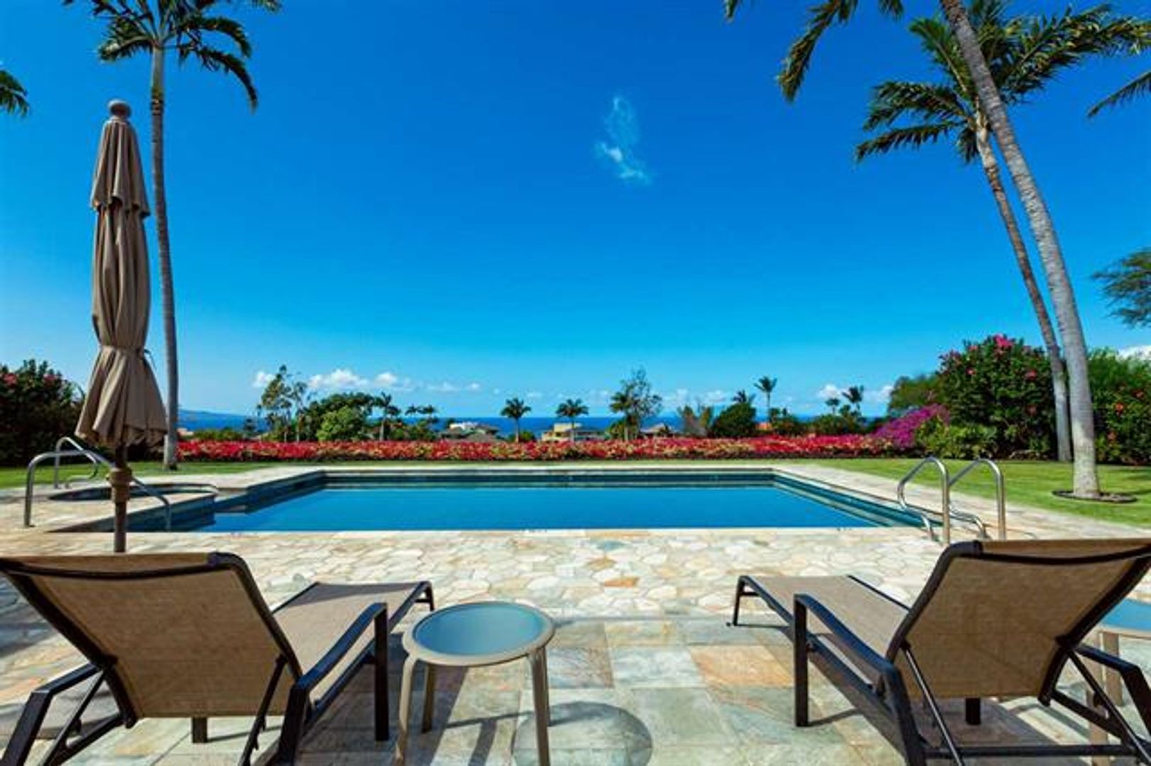 Magnificent views of the ocean and sunset from the community saltwater hot tub, pool, fitness center, and pavilion-BBQ. The 12-plus acre grounds are gorgeous and well maintained overlooking the expanse of the Wailea Blue golf course.